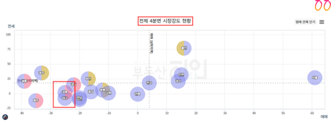 경상북도와 대구는 비슷한 흐름을 보여주고 있는 곳으로서 22년도서부터 꾸준한 하락세를 이어가고 있고, 특히나 경북 지역 중에 대구가 가장 큰 폭으로 낮아지고 있는 곳 중 하나입니다.